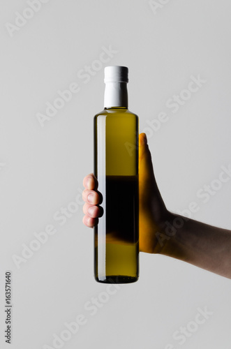 Olive / Sunflower / Sesame Oil Bottle Mock-Up - Male hands holding a oil bottle on a gray background