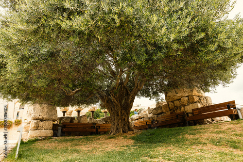 bench, shade, park, historic, stone, ancient, greenery, outdoors, nature, landscape, calmness, peaceful, relaxation, heritage, architecture, seating, foliage, branch, leaf, natural, environment, scenic, serene, green, parkland, historic site, cultural, landmark