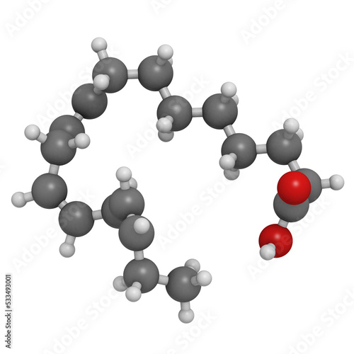 Omega-3 unsaturated fatty acid (alpha-linolenic acid), molecular model.
