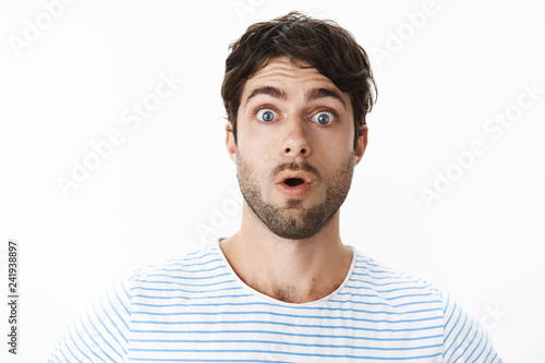 Omg you kidding. Headshot of impressed speechless and amazed handsome male with bristle and blue eyes saying wow, gasping with mouth opened widen eyes at camera in shock and astonishment