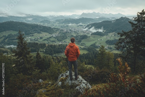 On a cloudy day, a man wearing a red technical jacket stands atop a rock in Valle Varaita, Piemonte, Northern Italy, and looks out at the Italian Alps landscape