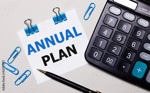 On a light background, a calculator, a pen, blue paper clips and a sheet of paper with the text ANNUAL PLAN. View from above