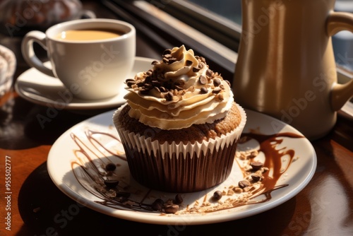 On a saucer lies a chocolate cupcake with white icing and sprinkles. There is a cup of coffee nearby.