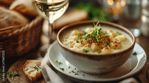 On a white table, a plate of potato soup, a glass of white wine, a rustic basket of rustic bread, beautiful serving, restaurant, and homemade food. unusual background.