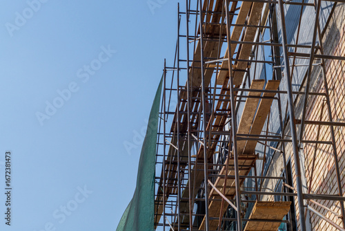 scaffolding, building, blue, sky, construction, scaffold, metal, mounted, facades, wooden, floorboard, repair, decorative, exterior, work, height, background, clear, workplace, business, design, frame, building site, house, engineering, structure, development, equipment, architecture, industry, high, industrial, construction site, concrete, estate, cement, project, build, wall, apartment, residence, city, residential, housing, modern, property, renovation, nobody
