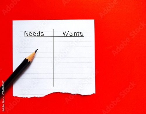 On red background - paper with text written Needs VS Wants - to learn difference between things that are essential for survival and well-being VS things enhance quality of life but are not essential