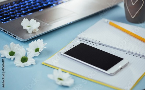 On the blue background notebook pencil, ruler and white flowers
