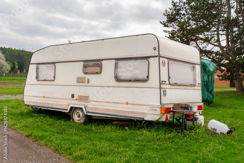 One classic white caravan with closed blinds parked on lush green campsite near Slapy lake. Peaceful rural landscape ideal for camping and nature tourism. Copy space.
