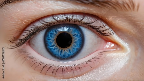 One eye of a white young man with a blue iris close-up
