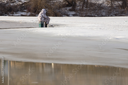 One fisherman on winter fishing sits on a box and catches fish. On the river dangerous thin ice. The danger of falling under the ice. Near the water from melted ice