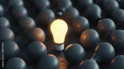 One glowing bulb in a group of darkened bulbs, representing innovation and creative thinking