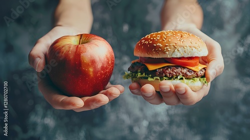 One hand holding apple fruit, other holding hamburger. Healthy natural organic fresh vegetarian food vs unhealthy processed fast junk food meat