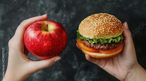 One hand holding apple fruit, other holding hamburger. Healthy natural organic fresh vegetarian food vs unhealthy processed fast junk food meat. Nutrition diet lifestyle, 8k image
