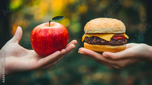 apple, hamburger, healthy, unhealthy, food, choice, diet, nourishment, eating, lifestyle, fruit, fast food, processed, organic, vegetarian, natural, junk food, fresh, meal, comparison, health, balance, decision, wellness, fitness, hand, dietary, eating habits, wholesome, caloric, organic food, alimentary, burger, snack, grilled, cheeseburger