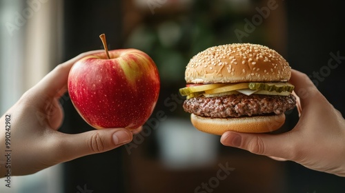 One hand holding apple fruit, other holding hamburger. Healthy natural organic fresh vegetarian food vs unhealthy processed fast junk food meat. Nutrition diet lifestyle, fitness eating choice