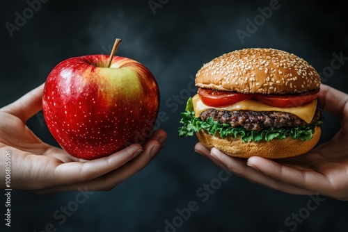 one hand holds a fresh apple, a symbol of organic vegetarian food the other hand holds a fast junk food hamburger a banner on food choices