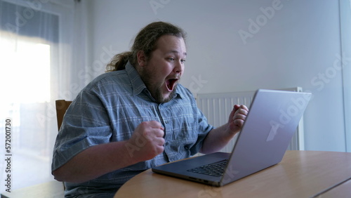 One happy overweight celebrating GREAT news in front of laptop. Over excited person dancing of joy using computer celebrates success