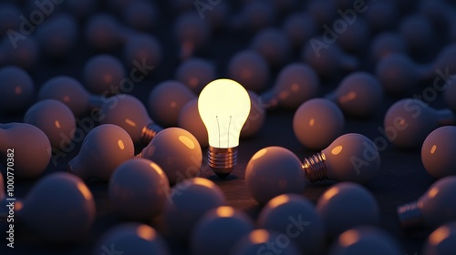 One illuminated light bulb standing out among many dim bulbs, symbolizing creative genius and innovation