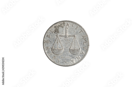 One Italian lire coin close-up from 1950s Italy, head side with libra icon. Isolated on white studio background. Archival collection coin of one lire value.