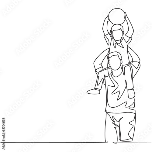 One line drawing of young happy father lift up his son while holding a ball on the shoulder and playing together. Parenting family concept. Continuous line draw design graphic vector illustration