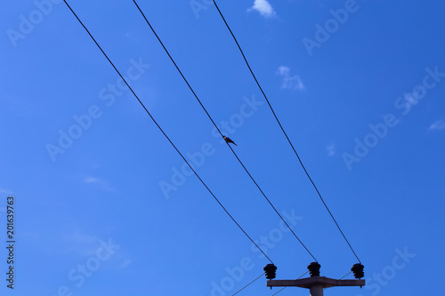 bird, wire, sky, animal, nature, background, line, blue, cable, electric, black, spring, silhouette, electricity, day, sitting, energy, peace, fly, beauty, post, environment, electrical, summer, small, cloud, danger, object, free, symbol, flying, little, peaceful, life
