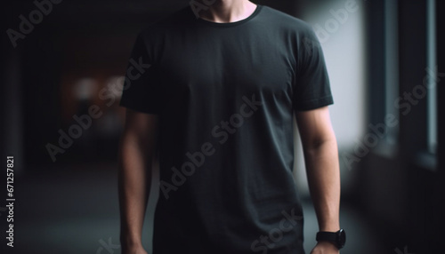 One muscular athlete exercising indoors wearing a dark t shirt generated by AI