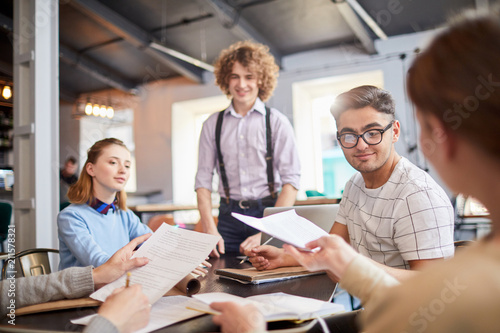 One of managers taking paper from hand of colleague while planning work or making notes at meeting