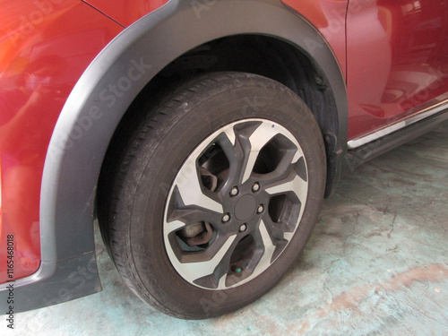 One of The Used and Worn Dirty Black Rubber Car Tire On The Light Blue Cement Garage Floor. Famous Branded Japanese Car. Red Car Paint. Beautiful Shot Close Up and Low Key Photography Image. JPG