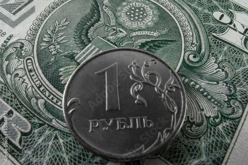 One ruble coin on a paper dollar. Top view.