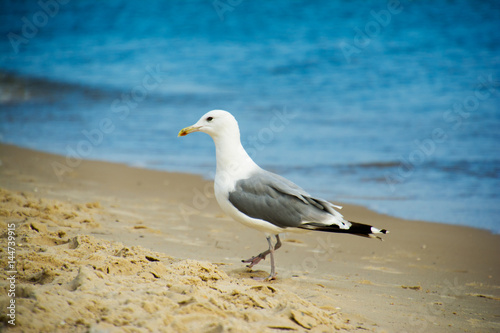 One seagull standing in sand on a beach