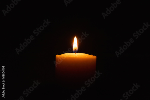 One single light candle burning brightly in the black background.Spiritual candle yellow flame. Flame of candle in the darkness.Copy space.
