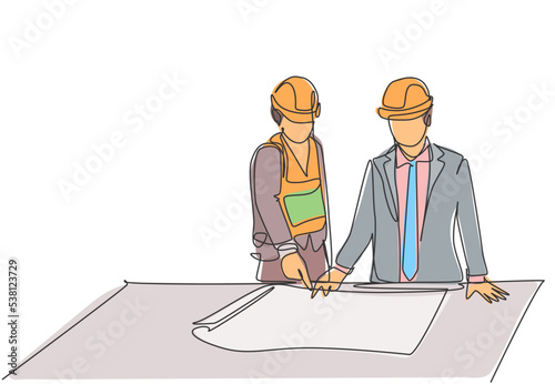 One single line drawing of young architect explaining sketch construction design to the manager. Building architecture business concept. Continuous line draw design illustration