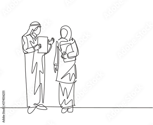 One single line drawing of young muslim manager deliver a job briefing to the female employee. Saudi Arabia cloth shmag, kandora, headscarf, ghutra. Continuous line draw design vector illustration