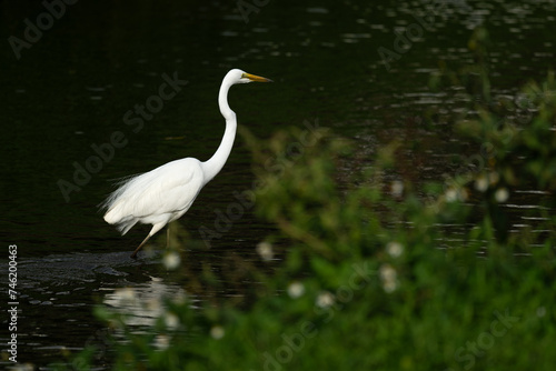 one white great egret standing in the water, dark background