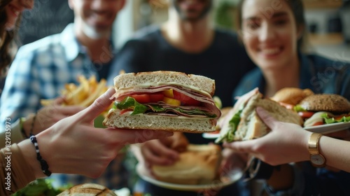 One worker passing around a homemade sandwich to his colleagues showcasing their camaraderie and sharing of food.