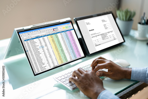 digital, bill, software, accounting, invoice, business, technology, tax, monitor, looking, accountant, online, account, spreadsheet, african, tablet, hybrid, bill, american