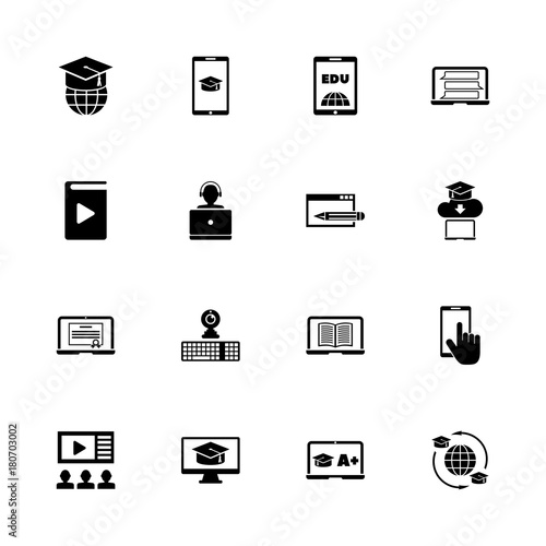 icon, online, training, education, course, tutorial, digital, book, technology, teacher, student, lecture, video, peer, mobile, computer, laptop, tablet, study, presentation, instructor, vector, media, cyberspace, set, pad, school, seminar, college, communicating, communication, diploma, graduate, graduation, hand, home, learning, literature, medium, person, studying, instruction, task, web, university, flat, black, line