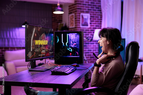 Online player winning video games tournament on live stream, using computer to have fun in rpg championship with multiple players. Female gamer celebrating action gameplay challenge win.