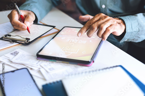 Online shopping. asian man writing shopping list in note pad using tablet computer to ordering, winter holidays shopping or christmas online shopping concept
