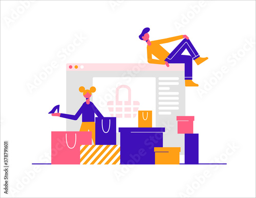 Online shopping concept. Modern vector minimalistic illustration. Young people makes purchases in the online store.