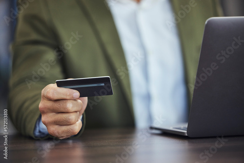 Online shopping, credit card and hands of businessman with laptop for ecommerce, payment and fintech. Digital finance, stock market and male with computer for business budget, investment and banking