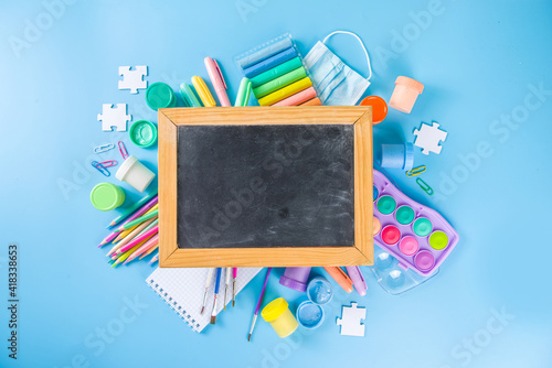 Online study and drawing, distantly painting class. Various colorful stationery and supplies for drawing. paints, pastels, pencils, brushes, tablet on blue background. Flatlay top view copy space