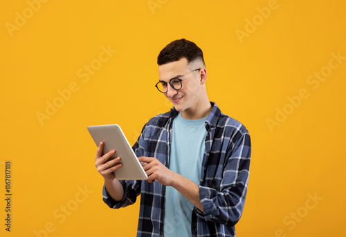 Online work, communiction, education. Cool young man browsing web on tablet pc over orange studio background. Funky student in glasses using touch pad, watching videos, posting in social media