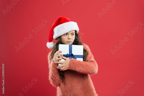 only mine. kid shopping sales. xmas boxing day. best christmas offer. little girl hold present box. happy new year gift. christmas holiday party. small girl in santa hat. greedy child red wall.