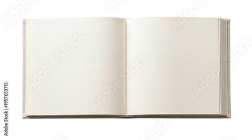 Open blank book with off-white pages, isolated on white background, top down view, Isolated on Transparent Background, png.