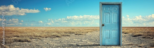 door, sky, landscape, blue, open, field, cloud, horizon, desert, dry, opportunity, entrance, exit, pathway, way, surreal, perspective, imagination, dream, travel, journey, escape, freedom, space, nobody, outdoors, climate, change, arid, future, destination, potential, vision, hope, mystery, isolated, sparse, tranquil, quiet, calm, remote, exploration, transition, choice, challenge, unusual, strange, odd, unique