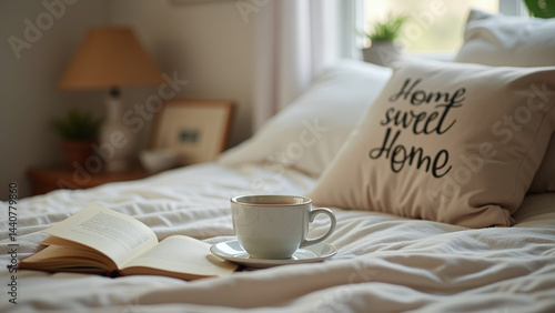 bed, book, open book, mug, saucer, pillow, text, bedding, white, cream, brown, lamp, table lamp, end table, nightstand, picture frame, plant, window, natural light, cosy, comfort, relaxation, indoor, bedchamber, page, hot drink, tea, drink, ceramic, decoration, minimalist, simplicity, cushion, lettering, typography, daylight, daytime, interior, room, home, rest, reading, leisure, calm, quiet