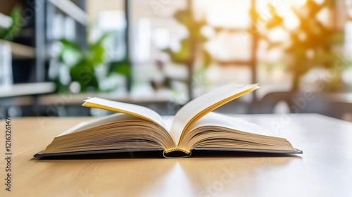 Open Book on Wooden Table in Bright Cafe Setting Reading Knowledge Education