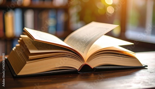 book, open, page, reading, library, cognition, education, vintage, antique, learning, literature, study, wood, table, brown, light, sunlight, glowing, warm, interior, bookshelf, backlit, closeup, detail, text, hardcover, cover, history