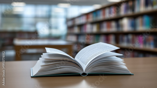 Open book on wooden table in library with blurred shelves background representing knowledge and education
